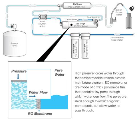 The RO membrane is the focal point of a reverse osmosis system, but an RO system also includes other types of filtration. RO systems are made up of 3, 4, or 5 stages of filtration.